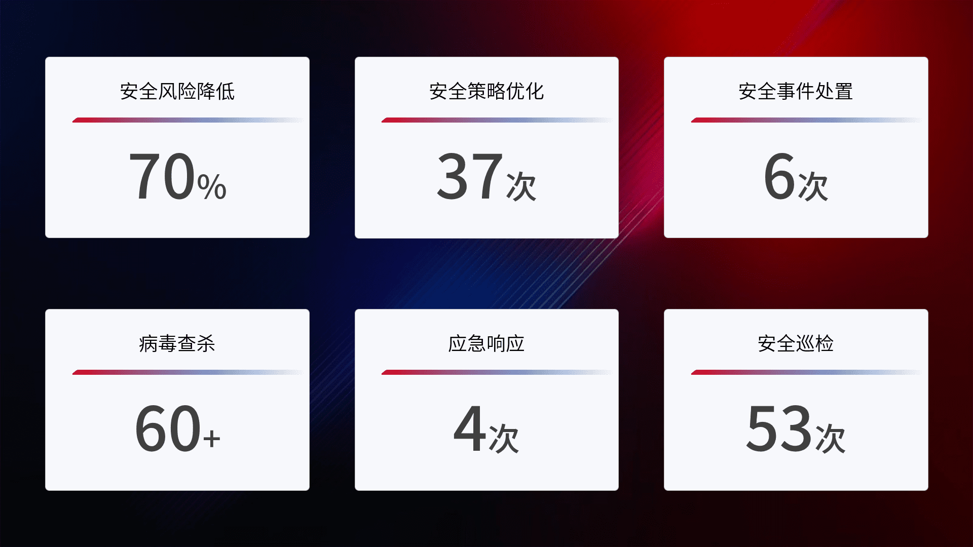 提供全面的安全事件报告体系,,包括处置报告、、周报、、、、季度和年度总结,,,,结合持续监控,,,帮助客户深入了解网络安全状况。。。。